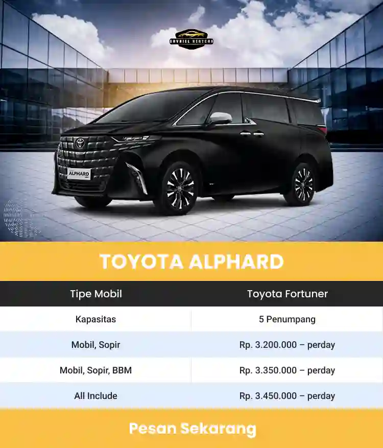 Dengan sistem sewa per hari Anda tetap bisa menyalurkan uang ke hal lain untuk menunjang pengalaman berkunjung yang menyenangkan. Kami juga menyediakan opsi sopit + BBM yang bisa langsung disewa sepaket dengan mobilnya.